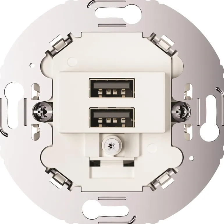 USB-latausliitäntä, jossa 2 A-tyypin USB-liitintä, max 3A (per liitin/yhteensä), ei datasiirtoa, ruuviliitos, 100-240V~, 50/60Hz, 5V= (+/-5%). Erillinen keskialuslevy ei sisälly, viite. 1033xxxx. Sopii R.classic/1930 -sarjan laitteisiin (adapterikehyksellä viite 13820x)