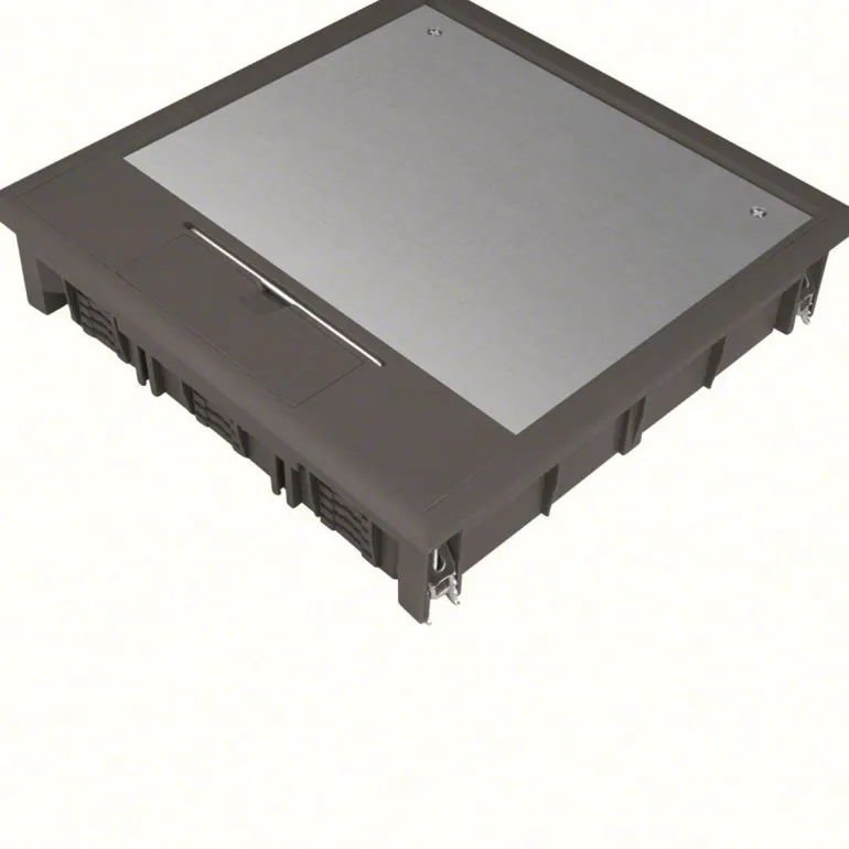 Lattiarasiakansi Q12 244×244 mm 5 mm lattiapinnoitteelle polyamidi-muovista, syvänmusta. Lattiarasiakansi DIN EN 50085-1 ja DIN 50085-2-2 mukaan. Sisältää yleiskiinnitystarvikepakkauksen, asennuspinnan päälle tulevalla peitekehyksellä, kojerasian asennuskorkeus säädettävissä portaittain 18 mm asti, liitäntämahdollisuudella litteälle lattiasuojalle FK17011, FK17035 tai FK19005.