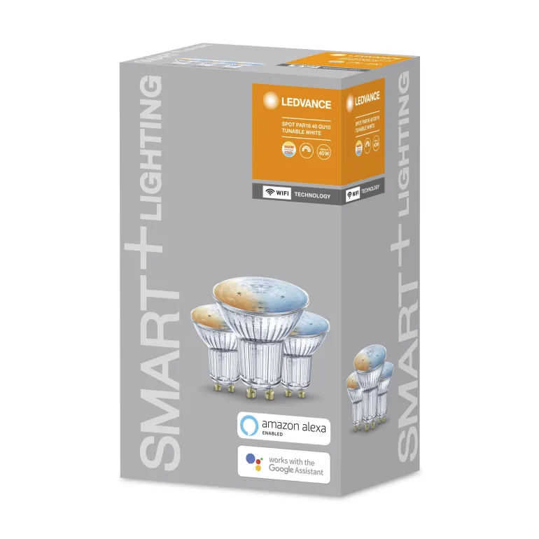 Himmennettävä LED-heijastinlamppu, PAR16, nastapistokkeella. Valovärin säätö lämpimän valkoisesta päivänvaloon Tunable White -toiminnon ansiosta. Langaton älykäs valaistustoiminto, jota ohjataan WiFi-verkkoprotokollalla. Helppo asentaa ja käyttää. WiFi-tuotteiden etuna aikaisempiin älykkäisiin järjestelmiin verrattuna on se, että et enää tarvitse lisäyhdyskäytävää valonlähteiden integroimiseen. Voit käyttää vain omaa reititintä, joka on jo asennettu.