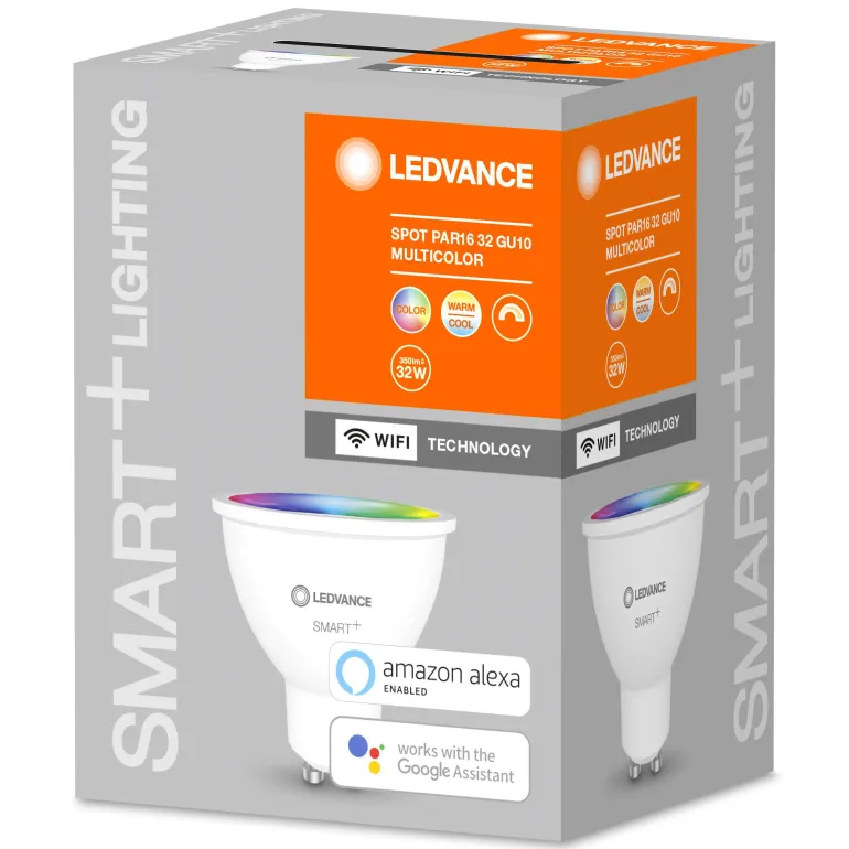 Himmennettävä LED-heijastinlamppu, PAR16, nastapistokkeella. RGB-väriohjauksen ansiosta valittavissa on noin 16 miljoonaa väriä. Valovärin säätö lämpimän valkoisesta päivänvaloon Tunable White -toiminnon ansiosta. Langaton älykäs valaistustoiminto, jota ohjataan WiFi-verkkoprotokollalla. Helppo asentaa ja käyttää. WiFi-tuotteiden etuna aikaisempiin älykkäisiin järjestelmiin verrattuna on se, että et enää tarvitse lisäyhdyskäytävää valonlähteiden integroimiseen. Voit käyttää vain omaa reititintä, joka on jo asennettu.