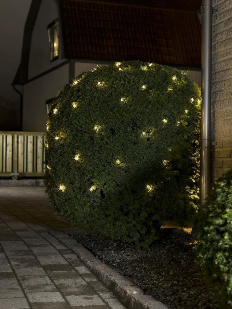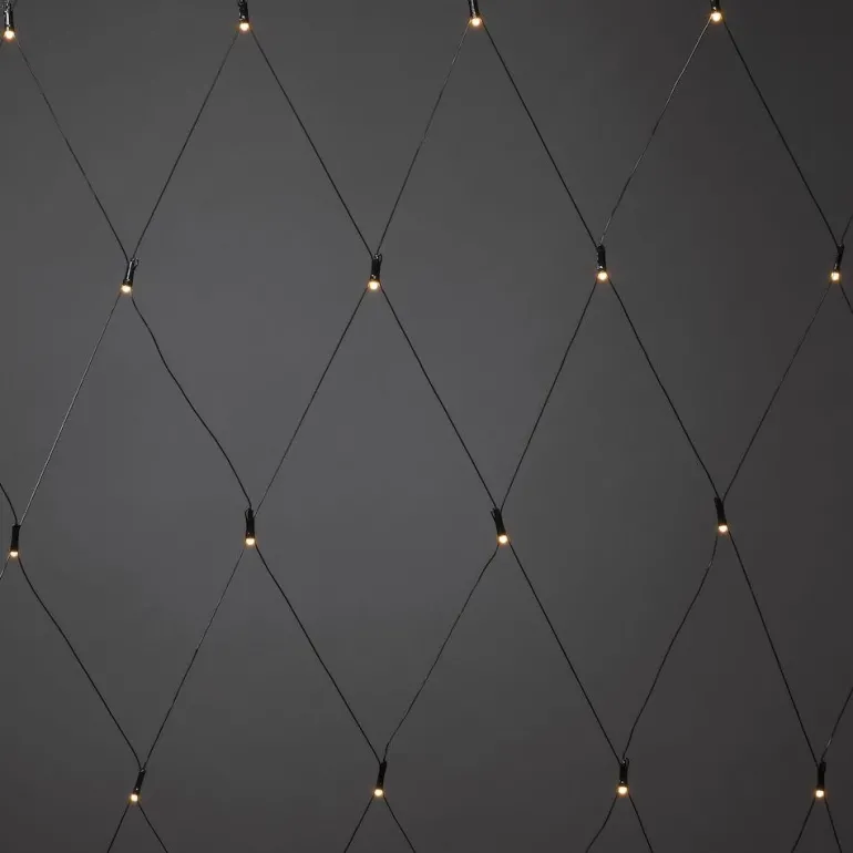 2×2 metrin verkkoa on helppo käyttää ja varastoida. Verkko on mukautettu ulkokäyttöön ja se koostuu 64 huurretusta LED-lampusta lämpimässä keltaisessa sävyssä.