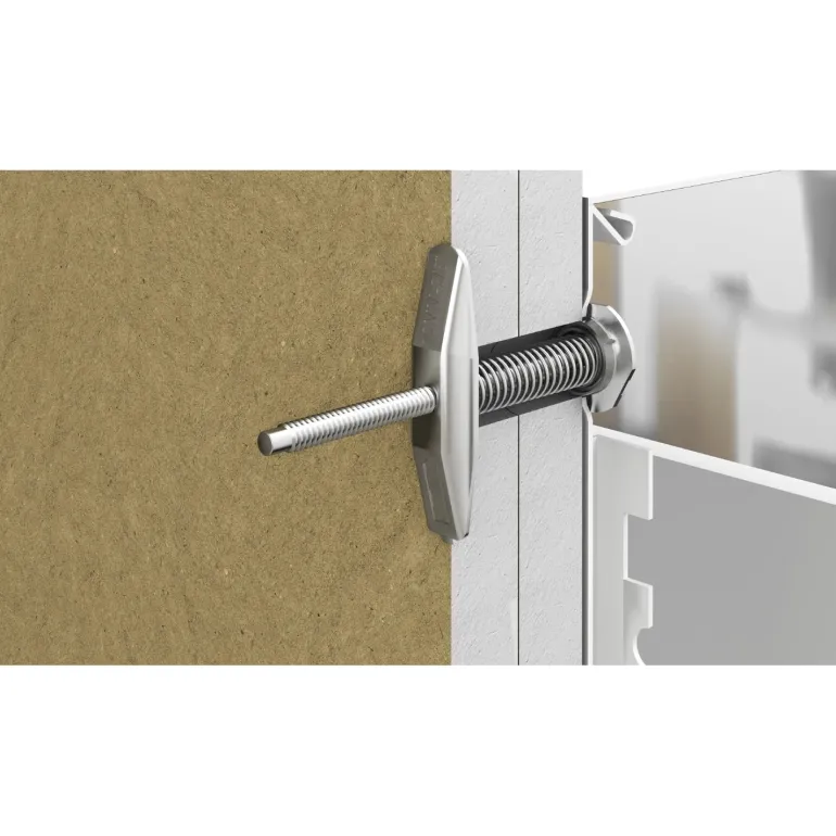 Asennus paneeleihin. Valikoima kattaa levypaksuudet 5-35 mm. Mukana uraruuvi tai koukku.