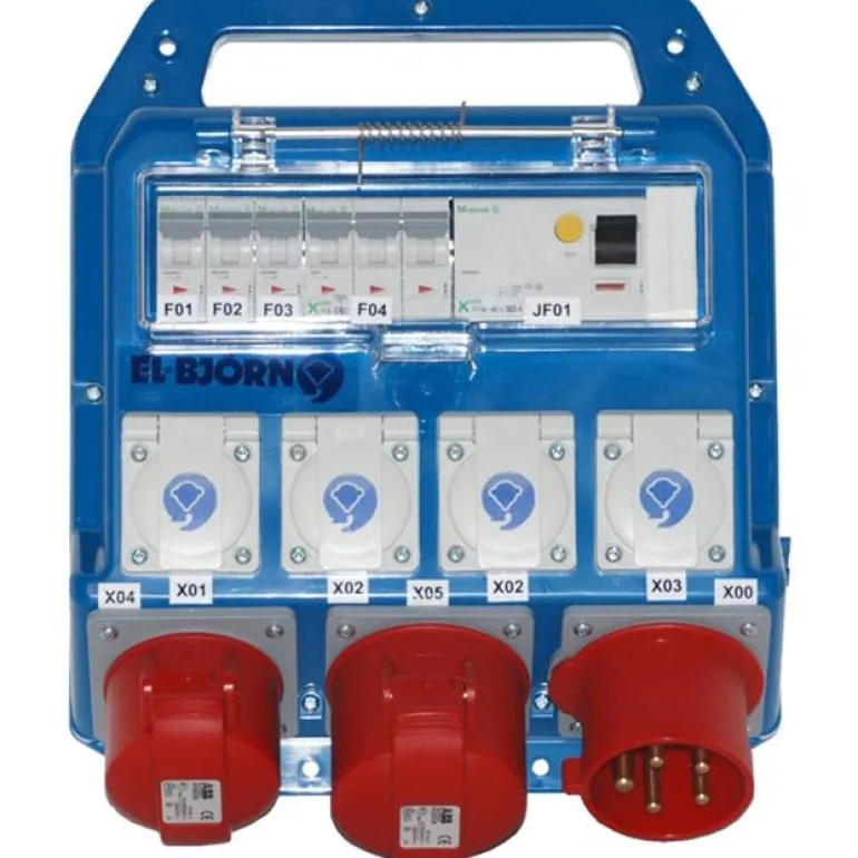 El-Björn U 32Mini/411-1 EN SEFI on kannettava liitäntäkeskus, jossa 1 kpl 5-nap./400 V 32 A, 4 kpl 2-nap./230 V 16 A, 1 kpl 5-nap./400 V 16 A ja 1 kpl 5-nap./400 V 32 A. Sopii suurehkoille rakennustyömaille. Pistokkeet suojattu 30 mA:n vikavirtasuojilla.