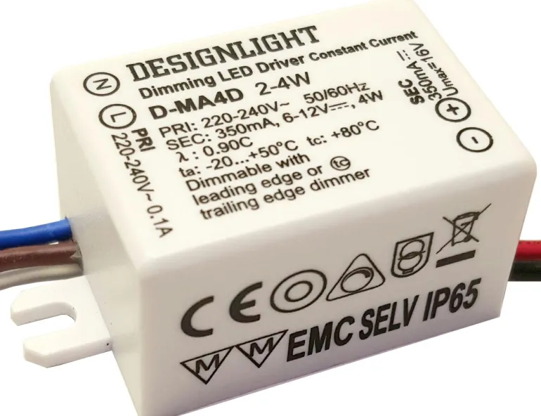 Suorakulmainen tai pyöreä liitäntälaite. Sopii asennettavaksi pieniin LED-alasvaloihin, joiden lähtövirta on 350 mA.