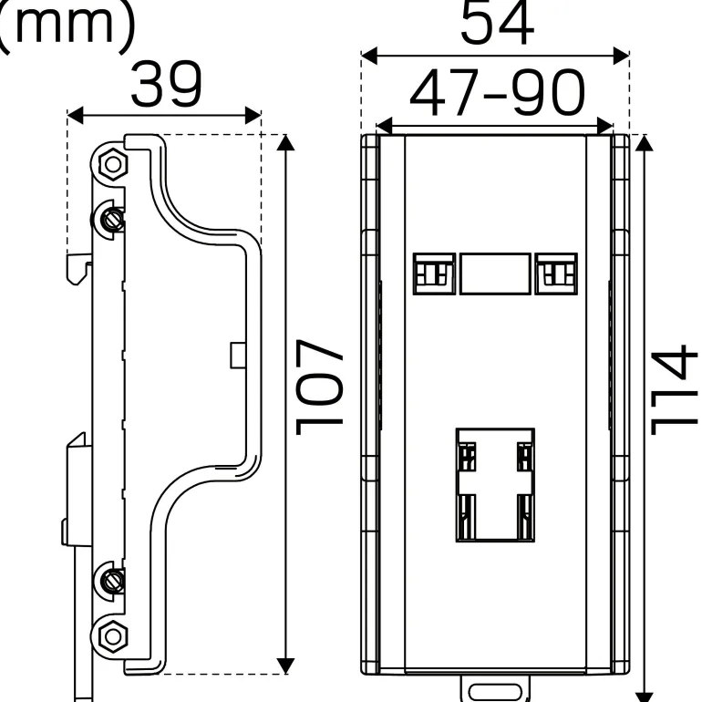 Jousikiinnike (47-90 mm) Hide-a-Liten suositun Jolly-sarjan asentamiseen suoraan DIN-kiskoon. Soveltuu myös useimpiin muihin Hide-a-Lite -liitäntälaitteisiin.