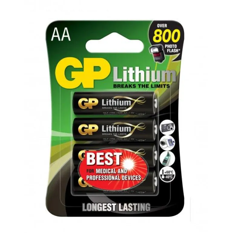 GP 14LF-2U4 on 4-pakkaus tehokkaita 1.5 V:n AA-litiumparistoja ammatti ja energiaa vativaan käyttöön. Sopii myös lääketieteellisiin laitteisiin, hälytyksiin, ammattikäyttöisiin taskulamppuihin ja mittalaitteisiin sekä käytettäväksi äärimmäisissä sääolosuhteissa. Akut ovat 40% kevyempiä kuin tavalliset alkaliparistot.