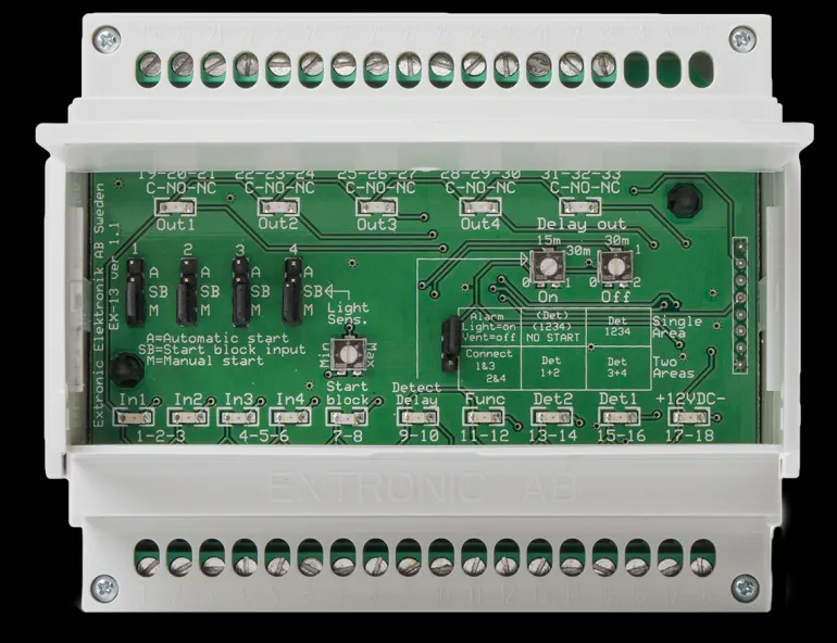 Ilmanvaihtoa ohjataan automaattisesti erillisellä lähdöllä. Säädettävä käynnistysviive estää tuuletuksen käynnistymisen lyhyen oleskelun aikana. Kun tilassa ei ole ketään, tuulettimet lakkaavat toimimasta asetetun sammutusviiveen mukaisesti siten, että tilojen ilmanvaihto varmistetaan. Ilmanvaihto voidaan käynnistää myös manuaalisesti impulssipainikkeella mutta ei sammuttaa manuaalisesti. Ohjelmointi on helppoa hyppyjohtimella ja tulojen ja lähtöjen LED-valot ilmaisevat toiminnan. Käytä erillistä kontaktoria, kun kytket loisteputkia ja suuria induktiivisia kuormia.
