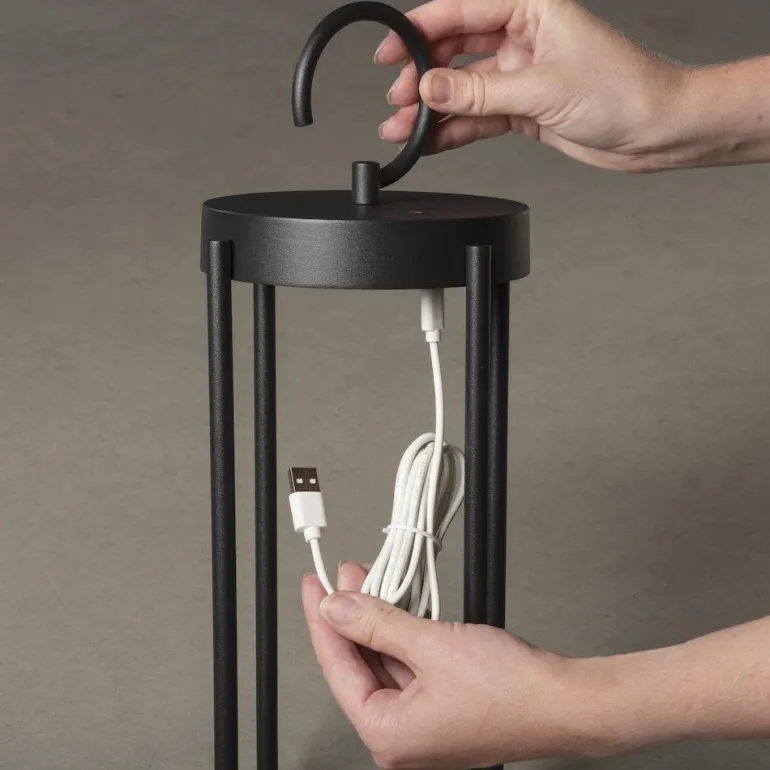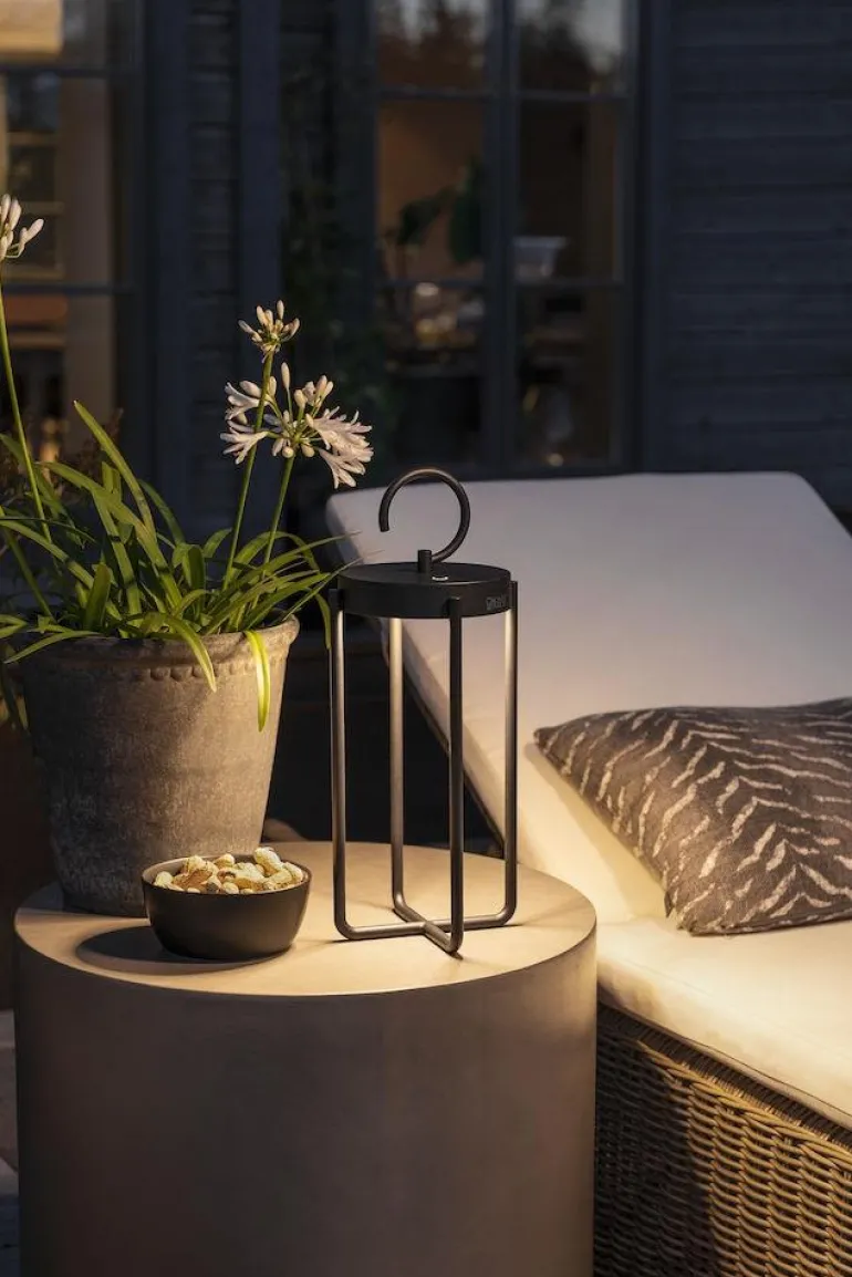 Musta alumiininen lyhtyvalaisin ulkokäyttöön. Lyhty on himmennettävä ja ladattavissa USB:llä.