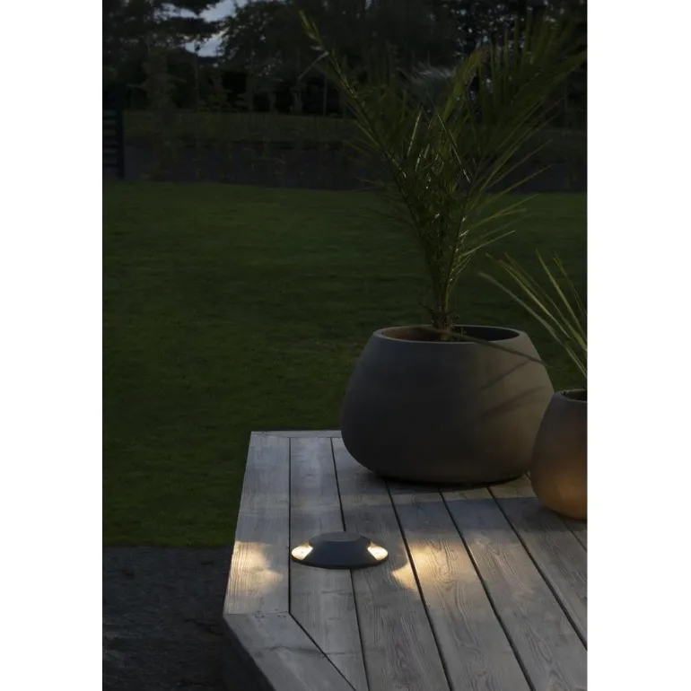 Suuri ja vankka antrasiittiharmaa maavalaisin terassille. Maavalaisimmen halkaisija on 20 cm ja korkeus 4,2 cm. 10 W:n sisäänrakennettu LED. Maavalaisimessa on IP65-luokitus.