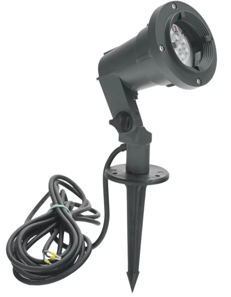 Kohdevalaisin valettua alumiinia maiseman ja kylttien valaisuun. LED-moduuli, seinä- tai maa-asennukseen. Seinäasennusta varten irrota maapiikki. Säädettävä kallistuspää. Mukana 5 m:n kaapeli.