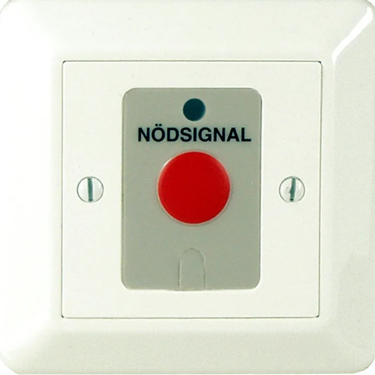 Kalvopainike, jossa teksti =HÄTÄSIGNAALI= ja valodiodi-indikointi. Uppoasennukseen laitelaatikkoon, jossa on 60 mm: n kiinnitysruuvien väli tai pinta-asennus nostokehykseen