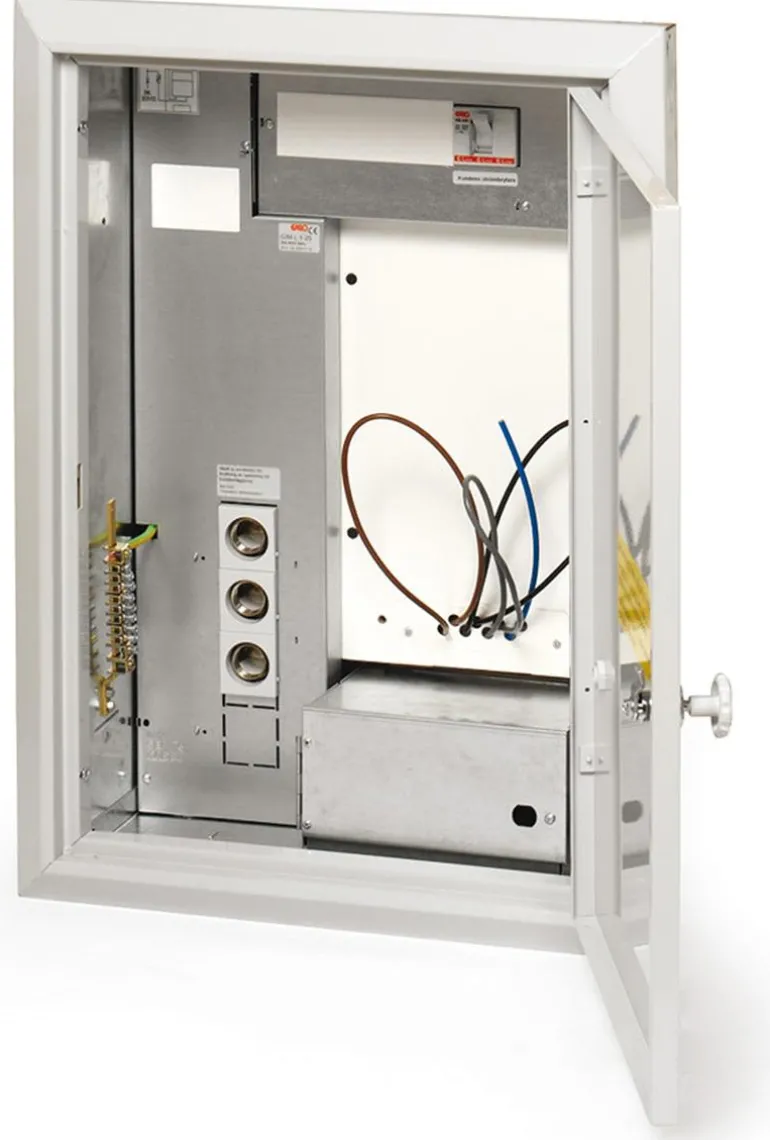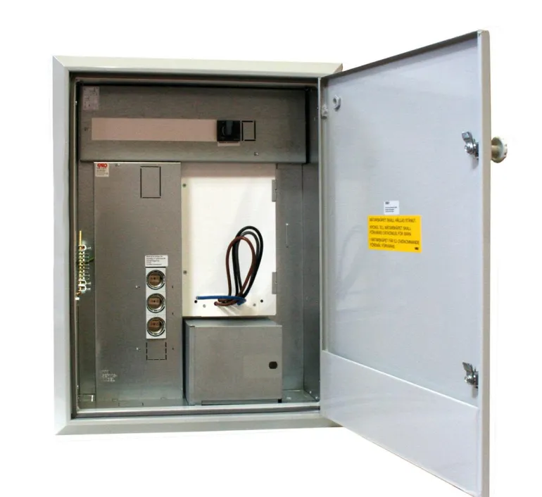 Mittarikaappi metallilevyä, uppoasennukseen, lisätiivistys vettä vastaan. Täydennetty lipalla päältä valuvaa vettä vastaan. Testattu ja hyväksytty kestämään myrskyn aiheuttamia puuskia jopa 30 m/s, mikä vastaa kovaa myrskyä. Testattu ja hyväksytty kestämään enintään 600 Pa, joka vastaa standardin EN1027 luokitusta 9A, ikkunoiden ja ovien vedenpitävyys. Testattu myös Mätarskåp Svensk Standard SS430 01 10:n mukaisesti (jossa on määritelty vain 300 Pa:n vaatimus). Kaappi on erittäin tiivis silikonin ansiosta.Varustettu saapuvalla haaroitusliittimellä max 50mm2 Al/Cu