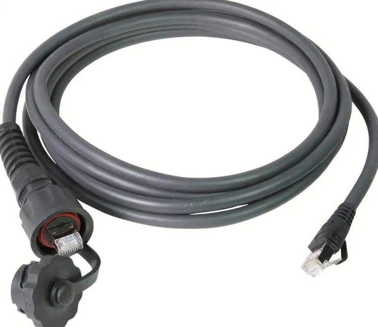 Modulaarikaapeli S/FTP C6A, jonka toiselle puolelle on asennettu tiivistesarja. Siinä on ”käännös ja lukitus” -mekanismi, joka tarjoaa Ip67-luokan suojan. Toisessa päässä on RJ45-urospää.