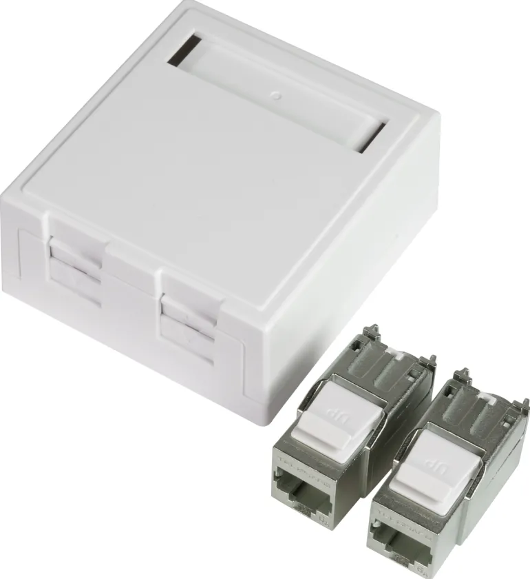 Modulaarinen pinta-asennettava pistorasia, jossa on luukku ja merkintäikkuna. 1×8 tai 2×8 STP C6A täydellisissä pistorasiapakkauksissa, jossa on suojattu modulaarinen jakkiliitin TCS QuickConnect.