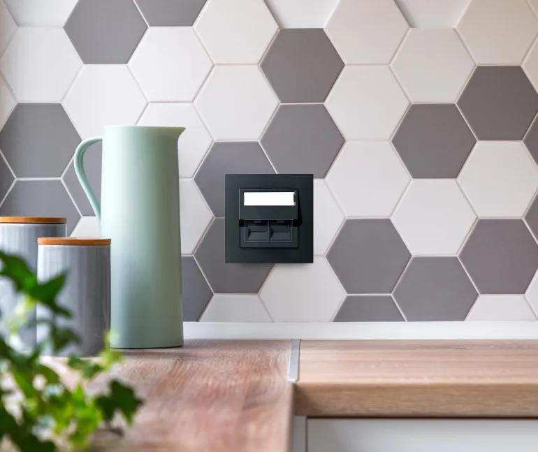 Modulaarinen pistorasia TL UTP C6 täydellisissä pistorasiapakkauksissa, jotka koostuvat suojaamattomasta modulaarisesta jakkiliittimestä TCS ToolLess, suorasta keskilevystä ja kehyksestä. Helppo liitäntä ilman työkaluja.