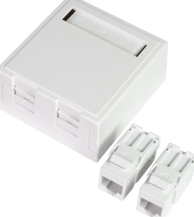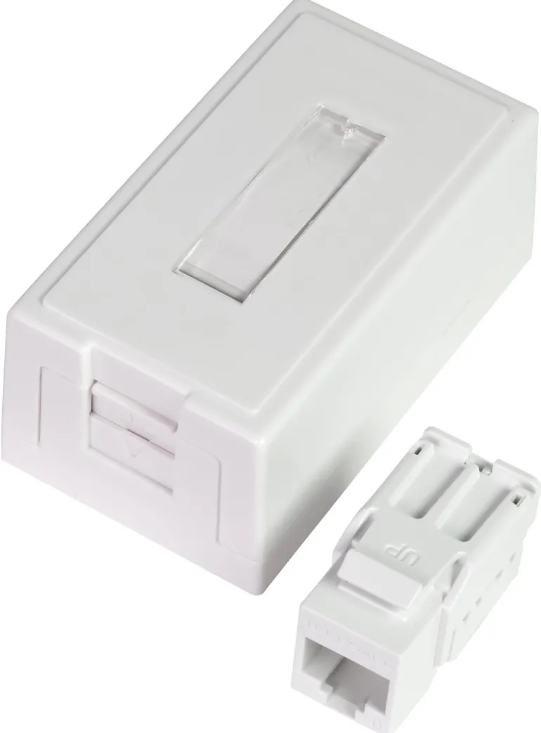 Modulaarinen pinta-asennettava pistorasia, jossa on luukku ja merkintäikkuna. 1×8 tai 2×8 UTP C6 täydellisissä pistorasiapakkauksissa, jossa on suojaamaton modulaarinen jakkiliitin TCS QuickConnect.