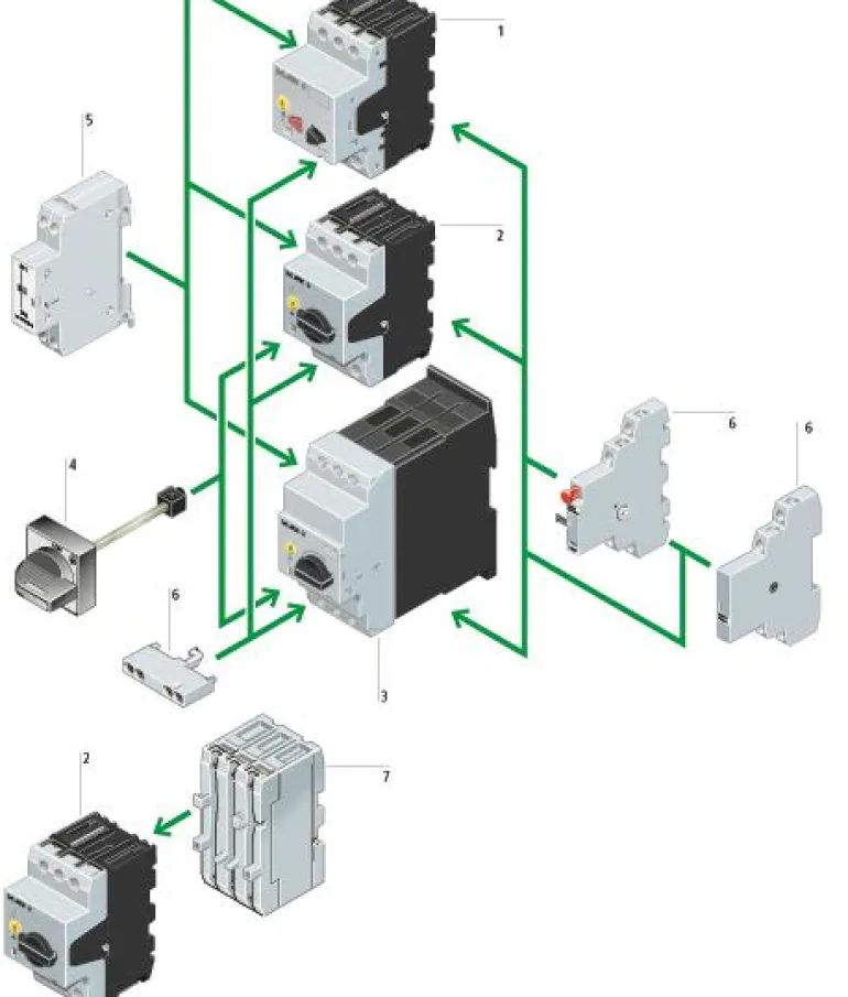 Kapseloimaton moottorin suojakytkin lämpöylikuormitussuojalla ja magneettisella oikosulkusuojalla. Asennetaan 35 mm kantokiskoon tai ruuveilla. Katkaisukapasiteetti nimellisvirtaan 10 A = 150 kA asti, nimellisvirralla 12-32 A = 50 kA.