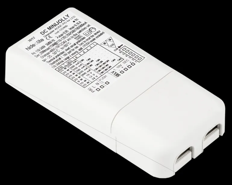 Hide-a-Lite Jolly Mini ON LED-muunnin sisäänrakennetulla PWM-himmentimellä. Pieni koko helppottaa asennusta 1½-rasiaan tai yhdessä valaisimen kanssa Spot Guard Gles:iin(74 667 02). Säätää ja ohjaa helposti monentyyppisiä LED-valonlähteitä, sopii sekä tasajännitteelle DC (10, 12 ja 24 V) että tasavirralle DC (350, 500, 550, 700, 850 ja 900 mA).