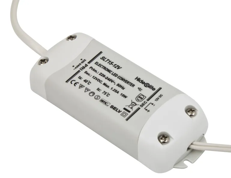Hide-a-Lite LED-muuntaja SLT on tarkoitettu käytettäväksi 12 V:n LED-valonlähteiden kanssa. Sisäänrakennettu oikosulkusuoja, ylikuormitussuoja ja ylikuumenemissuoja automaattisella uudelleenkäynnistyksellä.