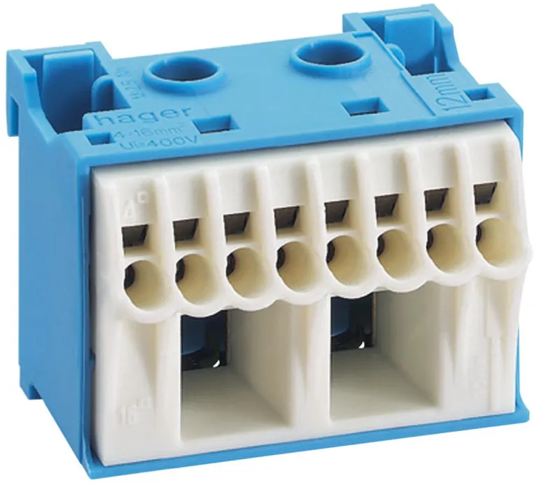 Hagerin normikoteloissa on nolla- / maaliittimet ruuvittomia liitäntöjä varten. Niitä voidaan toimittaa myös erikokoisina lohkoina nolla- tai maakaapeleille. Voit nyt yhdistää nolla- ja maadoituslaitteet juuri niin kuin haluat. Liittimissä on pikaliitäntä 1,5 mm² – 4 mm² ja ruuviliitäntä 1,5 mm² – 16 mm². Järjestelmässä on myös erilliset pidikkeet kullekin kotelotyypille ja versio DIN-kiskolle. Nastat ovat kosketussuojatut. Liitinlevy liitinlohkojen liittämistä varten.