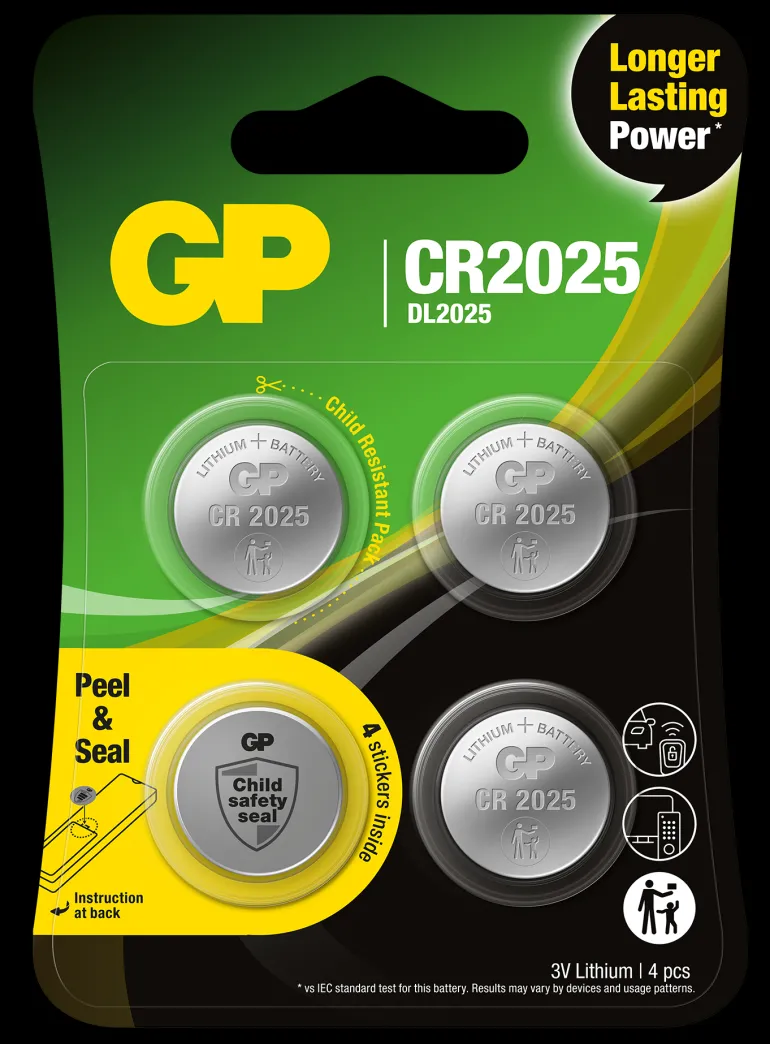GP PowerBank CR2025 on 3V litium-nappiparisto, korkea energiatiheys, alhainen paino, pitkä käyttöikä. Korkealla suorituskyvyllä alhaisissa lämpötiloissa -20 ° C:seen asti. Paristot soveltuvat monenlaisiin pieniin elektronisiin laitteisiin, kuten leluihin, kelloihin, auton avaimiin, kassakaappeihin, kaukosäätimiin, laskimiin, kameroihin ja vastaaviin. 4 kpl.