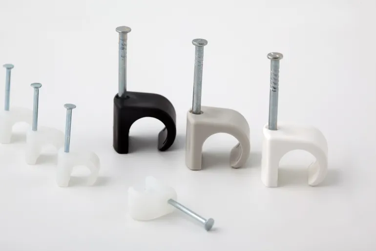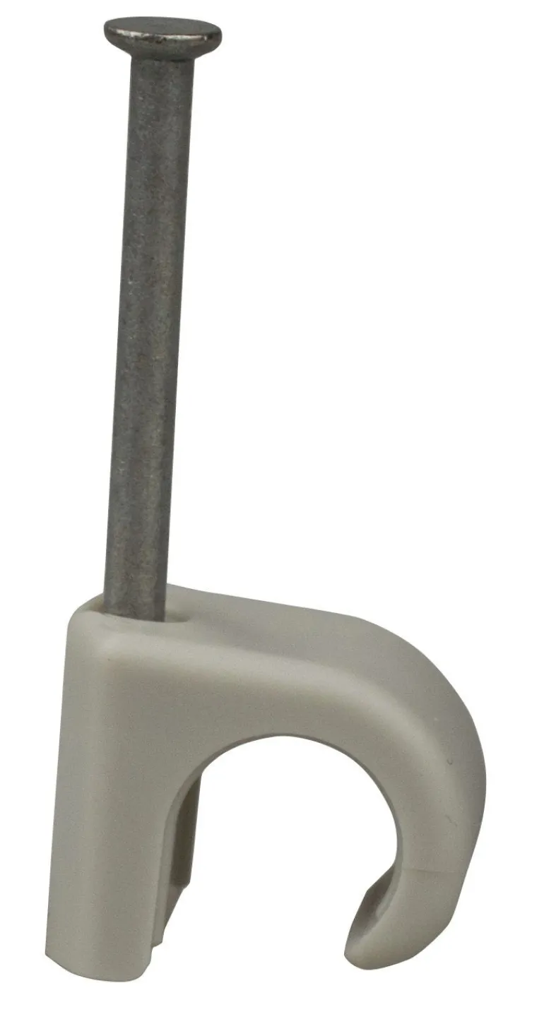 Naulakiinnike, jossa sähkösinkitty karkaistu teräsnaula litteiden kaapelien asentamiseen.