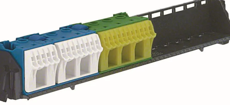 Ylimääräinen nolla- ja maakisko VE-koteloille, leveys 12-18 moduulia, ja Ve-kotelolle, UV-säteilyn kestävä. Maadoitusliittimessä on 3x16mm² + 11x4mm² liitännät.