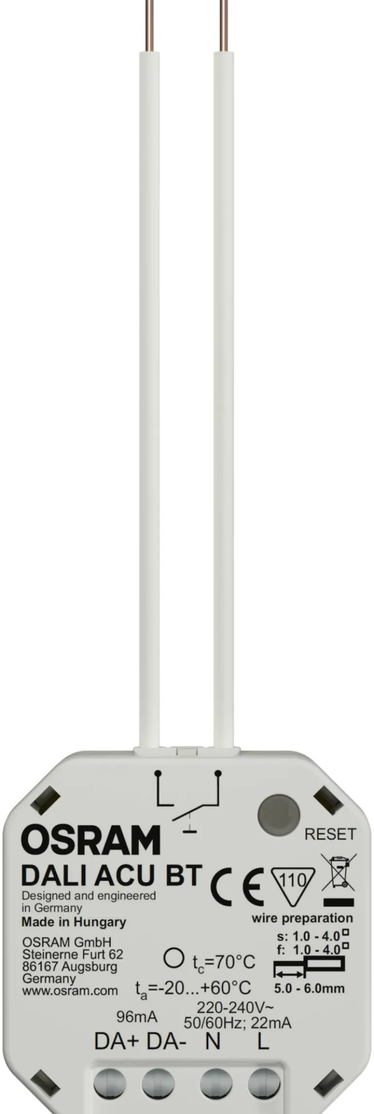 DALI ACU BT -ohjain mahdollistaa helpon valaistuksen ohjaamisen ja valkoisen sekä Tunable White (TW) -valon ohjauksen, valaistussarjojen tallennuksen ja manuaalisen ohjauksen milloin tahansa älypuhelimen välityksellä sekä ON/OFF-toiminnon ja valaistuksen vakiopainikkeiden avulla. Voidaan yhdistää OSRAM DALI -läsnäolo- ja liiketunnistimiin. Yhteen yksikköön voidaan liittää jopa 32 elektronista ohjauslaitetta. Ilmainen sovellus (iOS ja Android). Sopii ihanteellisesti esimerkiksi luokkahuoneisiin, toimistoihin, kokoushuoneisiin ja sisäänkäyntien yhteyteen.