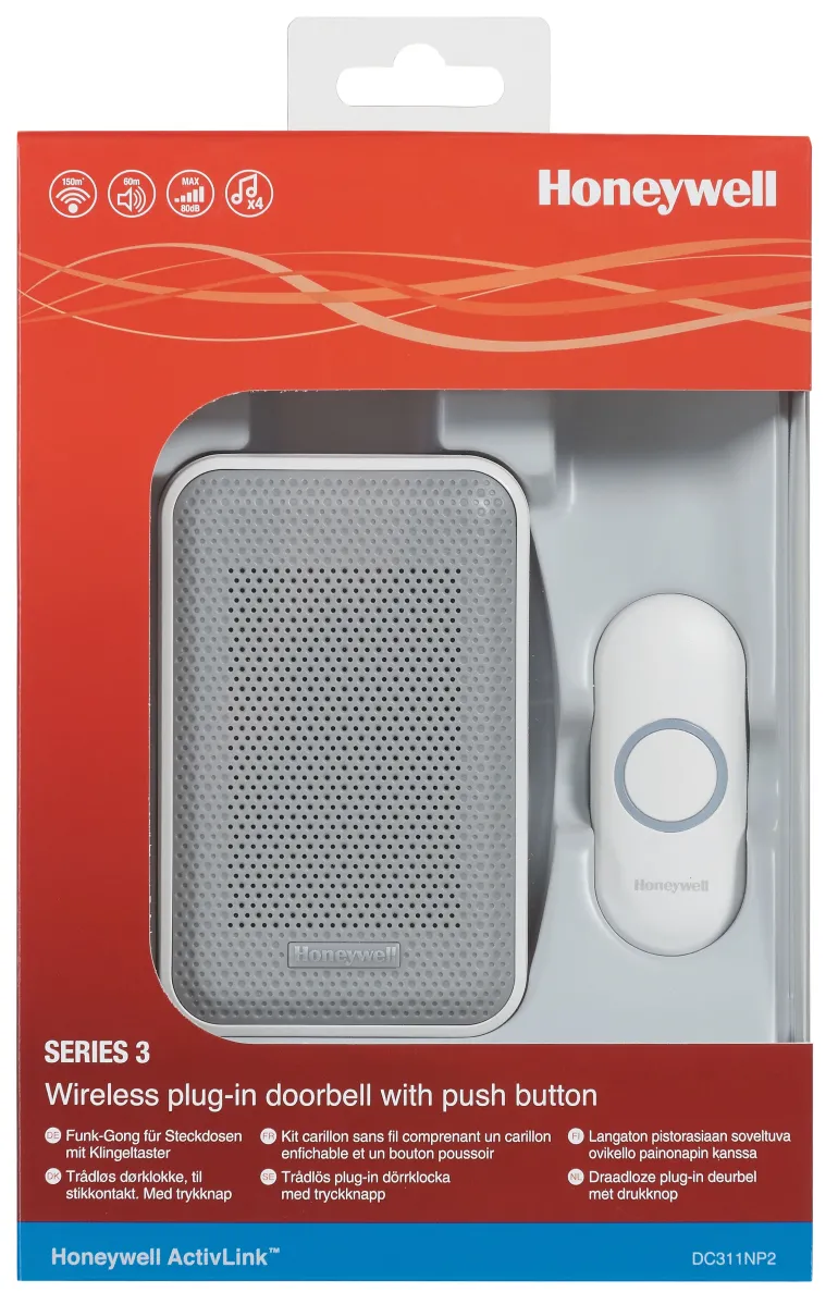 Honeywell Home DC311NP2 on valkoinen ovikello, jossa on tyylikäs muotoilu ja takana pistoke. Ovikelloon ei siis tarvitse vaihtaa paristoja. Ovikello DC311NP2 on valmis käytettäväksi suoraan pakkauksesta ja muodostaa langattoman yhteyden oven painonappiin 150 metrin etäisyydellä. Ovikellon voi sijoittaa minne tahansa talossa. Mukana säänkestävä painike ja paristo CR2032. Äänenvoimakkuus 80 dB.
