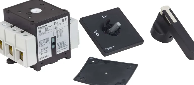 Musta työkytkin pitkällä vääntökahvalla. Oveen asennettava, viisireikäinen asennus. TeSys VARIO, 125A.