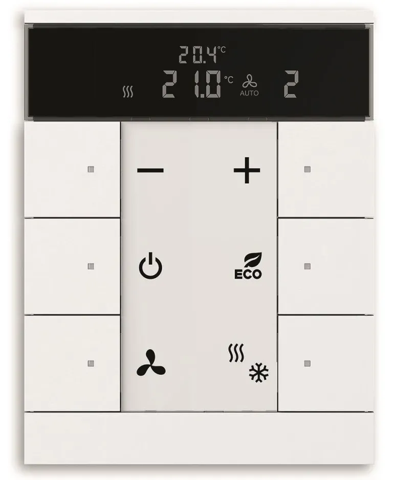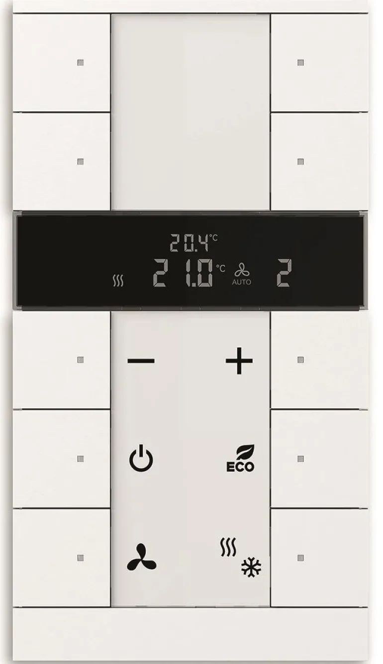 Vapaasti konfiguroitava monitoimiohjauselementti RTC-orjatoiminnolla. Integroitu KNX-väyläliitäntäyksikkö ja merkintäalue. Tuki KNX-toiminnoille innovatiivisella värikonseptilla (keltainen = valaistus, sininen = verhot, oranssi = RTC, magenta = tilanneohjaus ja valkoinen = neutraali / ei toimintoa) tai tavallisella punaisella/vihreällä valaistuksella. Lämpötila-anturi.