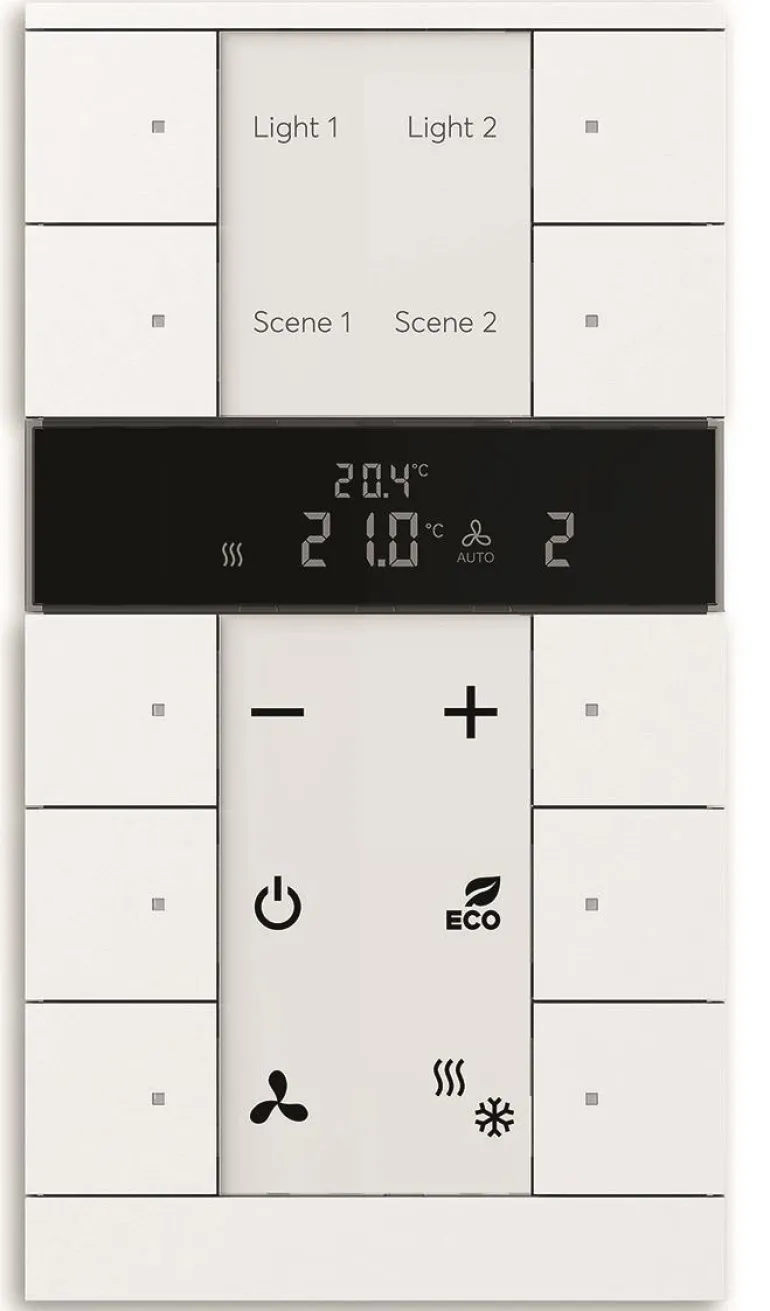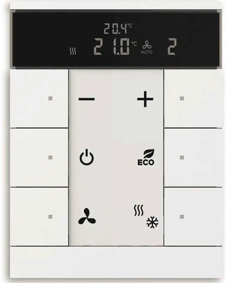 Vapaasti konfiguroitava monitoimiohjauselementti RTC:llä ja integroidulla KNX-väyläliitäntäyksiköllä. Merkintäalue. Tuki KNX-toiminnoille innovatiivisella värikonseptilla (keltainen = valaistus, sininen = verhot, oranssi = RTC, magenta = tilanneohjaus ja valkoinen = neutraali / ei toimintoa) tai tavallisella punaisella/vihreällä valaistuksella. Lämpötila-anturi.