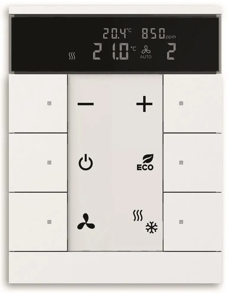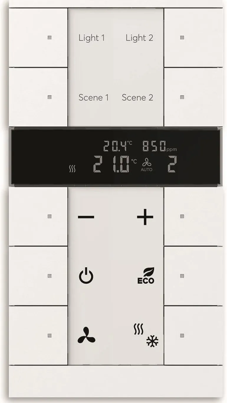 Vapaasti konfiguroitava monitoimiohjauselementti RTC:llä sekä hiilidioksidi- ja kosteusantureilla. Integroitu KNX-väyläliitäntäyksikkö ja merkintäalue.