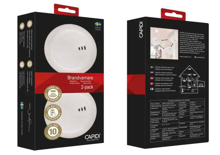 CAPiDi CAP388B on optisella savunilmaisimella varustettu palohälytin, joka voidaan liittää langattomasti verkon kautta rajoittamattomaan määrään muita laitteita. Kaikki kytketyt laitteet hälyttävät 3 sekunnin kuluessa, jos savunilmaisin havaitsee savun. Paristoja ei tarvitse vaihtaa, koska tuotteessa on sisäänrakennettu litiumparisto, joka kestää tuotteen koko käyttöiän (10 vuotta). CAPiDi CAP388B:n kantama on 200 metriä ja se varoittaa akun tyhjenemisestä.