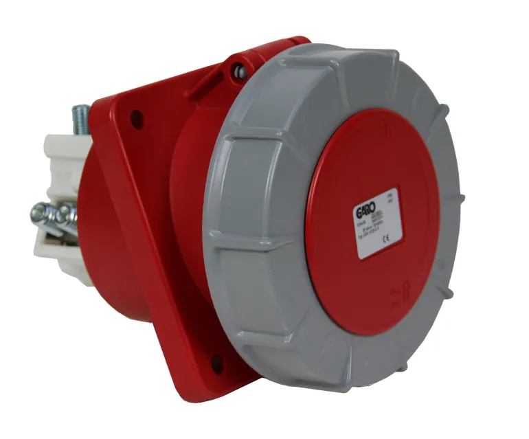Vedenpitävä pistorasia paneeliasennukseen ohjaustapilla. Kiinnityslevyn mitat 114x114mmLiitettävä johtimen pinta-ala 16-50 mm² ja kiinteälle kaapelille 16-70 mm²Suojausluokka IP67.