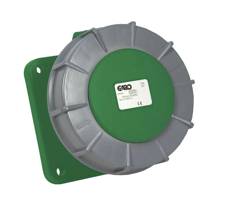 Vedenpitävä pistorasia paneeliasennukseen ja ohjaustapilla. Asennuslevyn mitat 120x120mm.