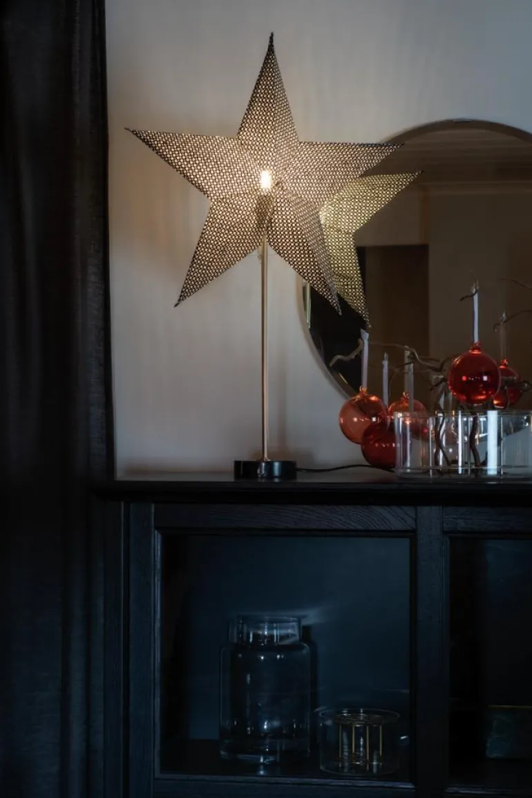 Konstsmide 1760-770 on musta paperitähti marmorijalustalla (musta). Lampun kanta E14. Musta johto, 230 V.