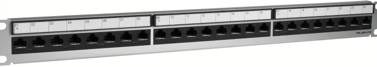 Suojaamaton patch-paneeli, joka on piirilevyrakenteinen, on kehitetty ja suunniteltu SS-EN 50173-1 -standardin mukaisesti ja se on OSA ELKO TCS C6 -takuujärjestelmää. Yhdistys tapahtuu LSA-terminaalilohkossa. Moduulipaneeli on täydellinen. Asennusteline E51 250 82 helpottaa asennusta. Kallistettu takareuna tarjoaa pehmeämmän rasituksen kaapelille.
