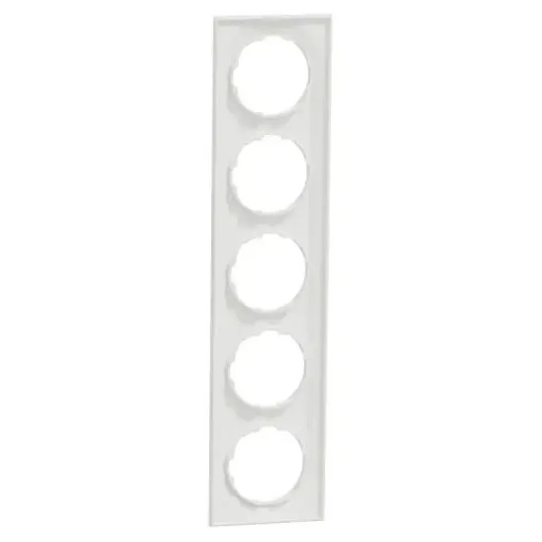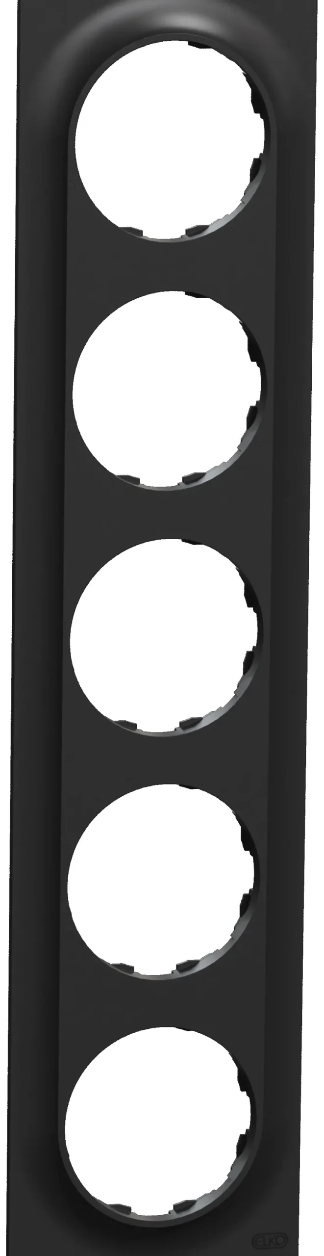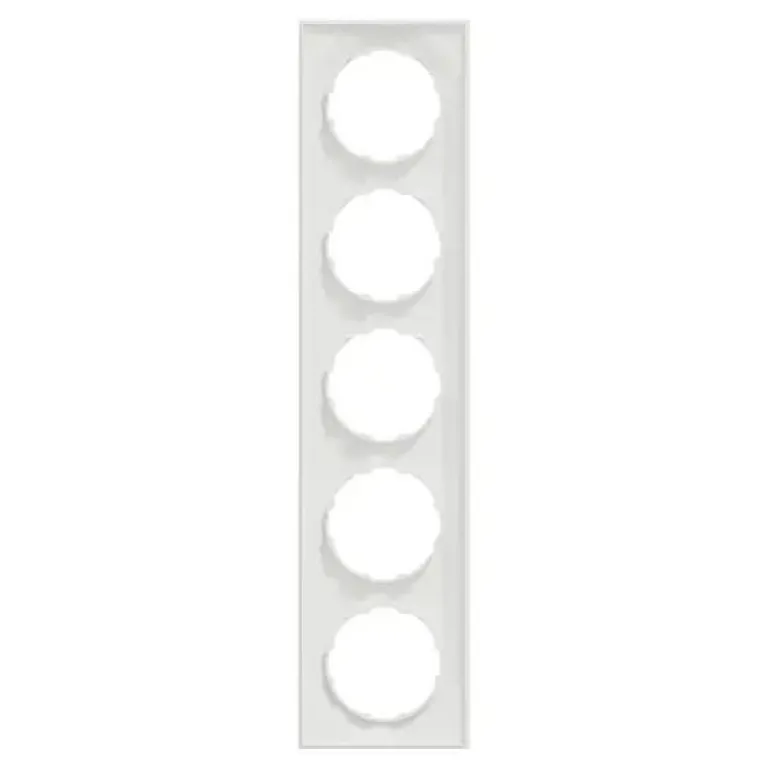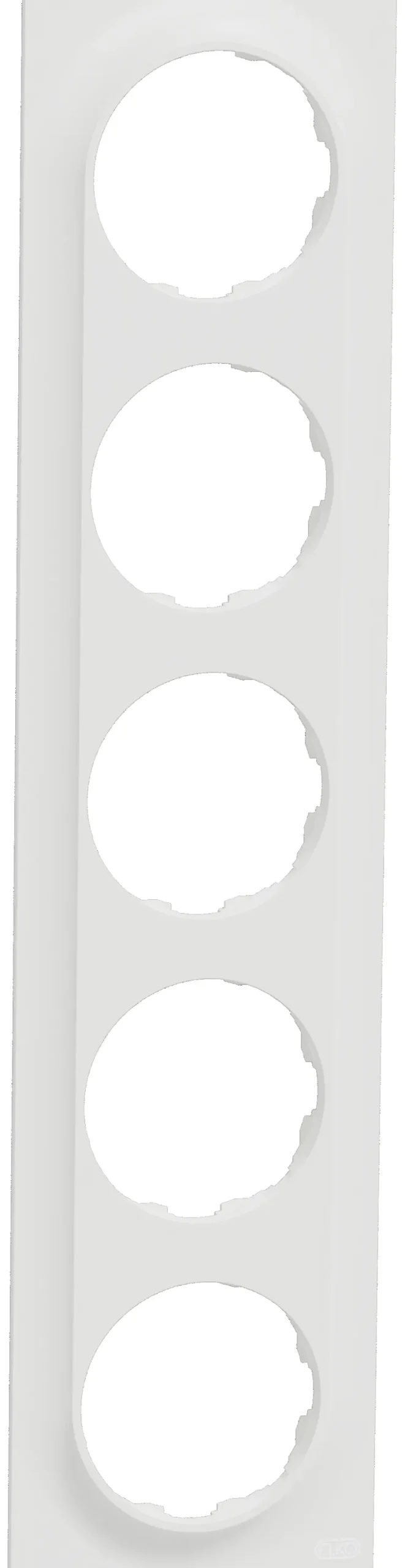 ELKO One 5-kehys, jonka mitat ovat (L) 87 mm x (K) 371 mm x (S) 10,5 mm. Se on valmistettu kierrätetystä polykarbonaatista (PC). Tuotteen väri on kirkkaan valkoinen (RAL 9003) ja se on mattapintainen. Se saavuttaa IP21-suojaustason.
