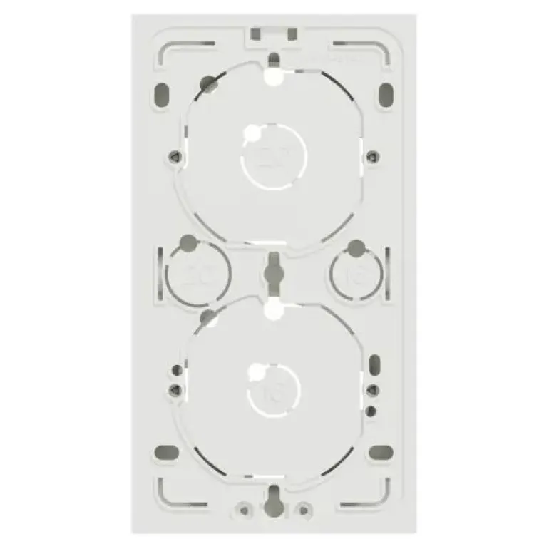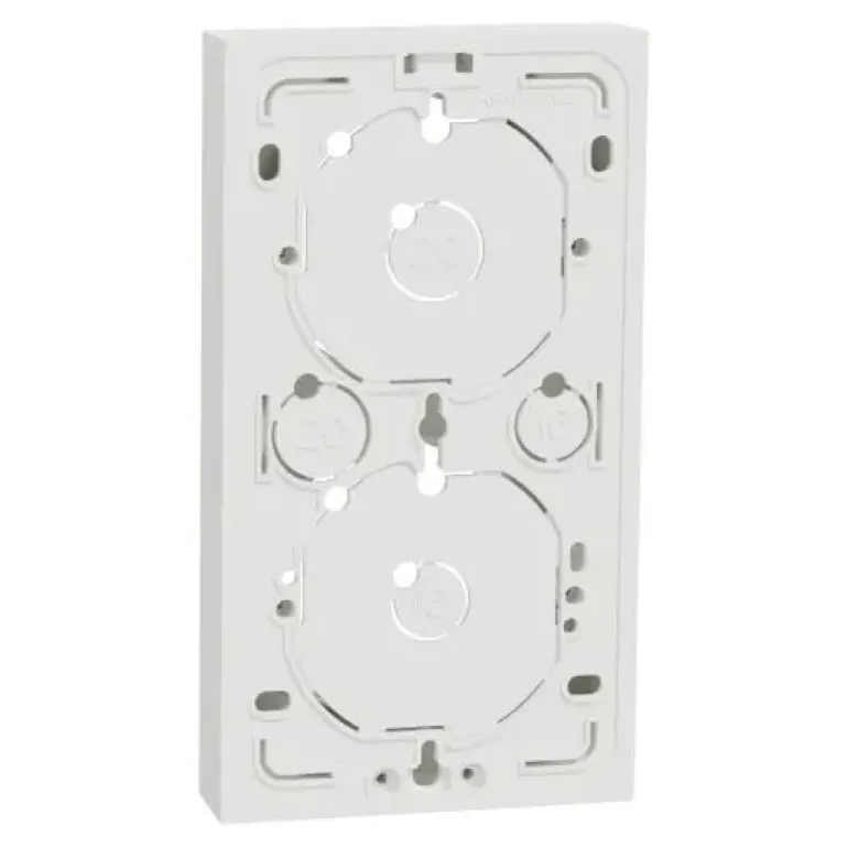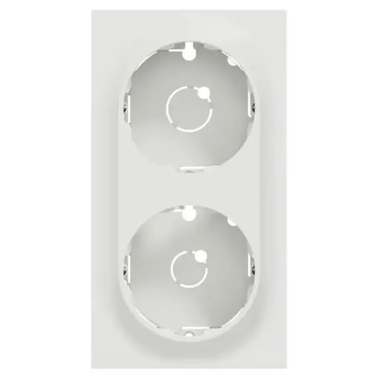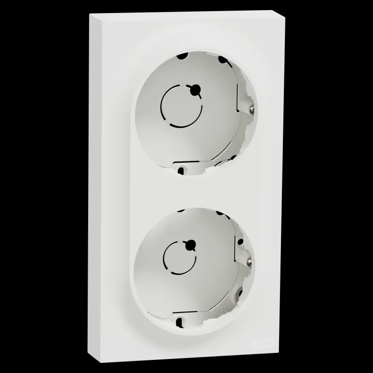 ELKO One 2-pintakojerasia matala, valkoinen. Tämä matala versio on optimoitu kytkimille, joissa on ruuviliittimet. Kun asennus tehdään olemassa olevan upporasian päälle, poistamalla pintakojerasian pohja, voidaan myös matalaan pintakojerasiaan asentaa tilaa vaativia tuotteita, kuten säätimiä.
