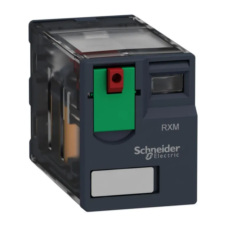 Zelio Relay -pistokantarele (4 vaihtokosketinta). Zelio-rele RXM: 2, 3 tai 4 C/O-kosketinta / 6-10-12 A, valinnainen liitinjärjestely (sekoitettu tai erillinen).