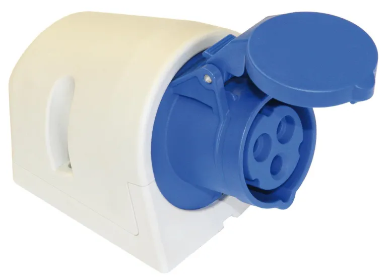 Ruuviton seinäpistorasia 16 A pikaliittimellä. Yhdistettävä johdinalue 1–2,5 mm² ja kiinteä kaapeli 1–4 mm².
