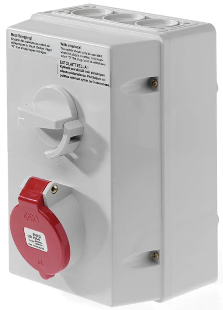 Eristetty vedenpitäväksi, seinäasennukseen. Pistorasian IEC-sähkövirta on 16 A ja napoja on 5 kpl.