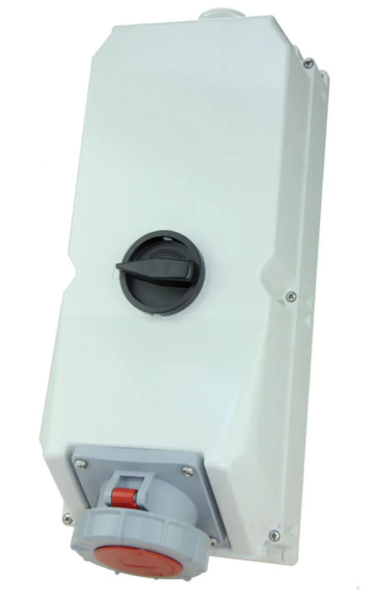 Eristetty vedenpitäväksi, seinäasennukseen. Pistorasian IEC-sähkövirta on 125 A ja napoja on 5 kpl.