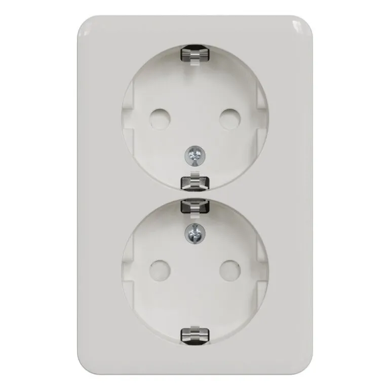 Exxact pinta-asennettava 2-pistorasia. Uuden malliston pistorasioissa pohjalevyn lisäkiinnitysreiät tekevät seinäkiinnityksestä luotettavamman. Uusi Exxact pinta-mallisto nyt RAL9003-värissä.
