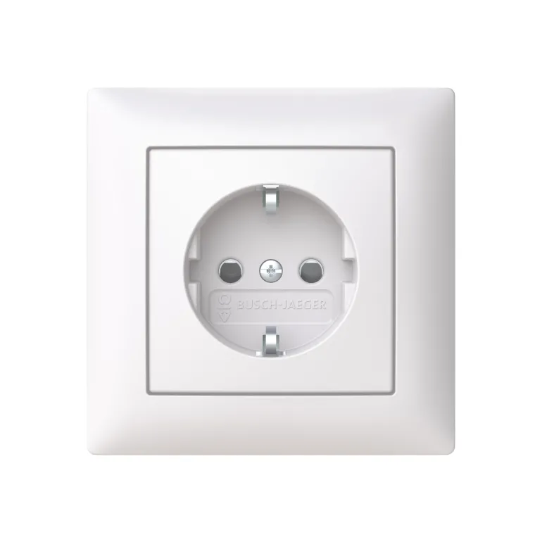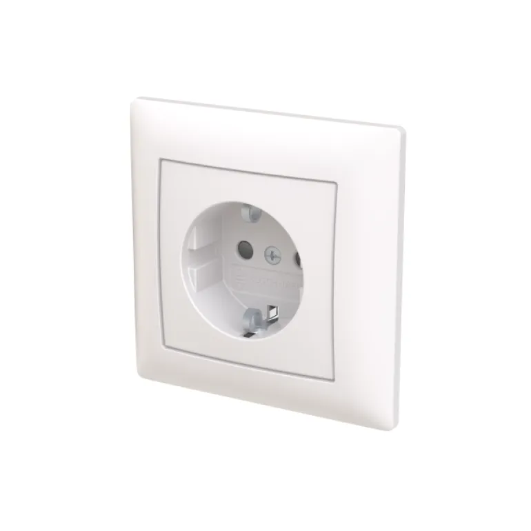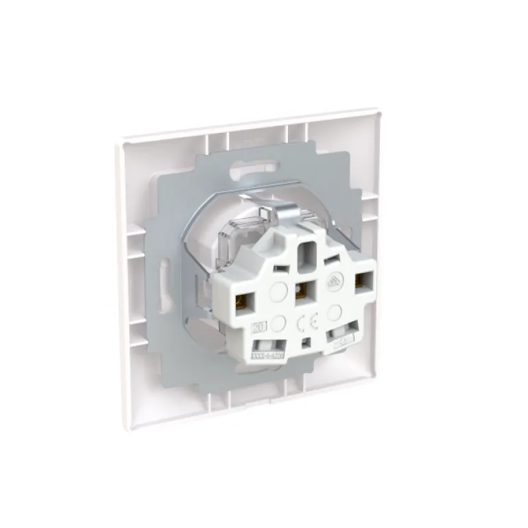 SAGA™1-osainen pistorasia peite- ja keskiölevyllä. Pistorasiassa on liittimet kahdelle johdolle kutakin kosketinta kohden.