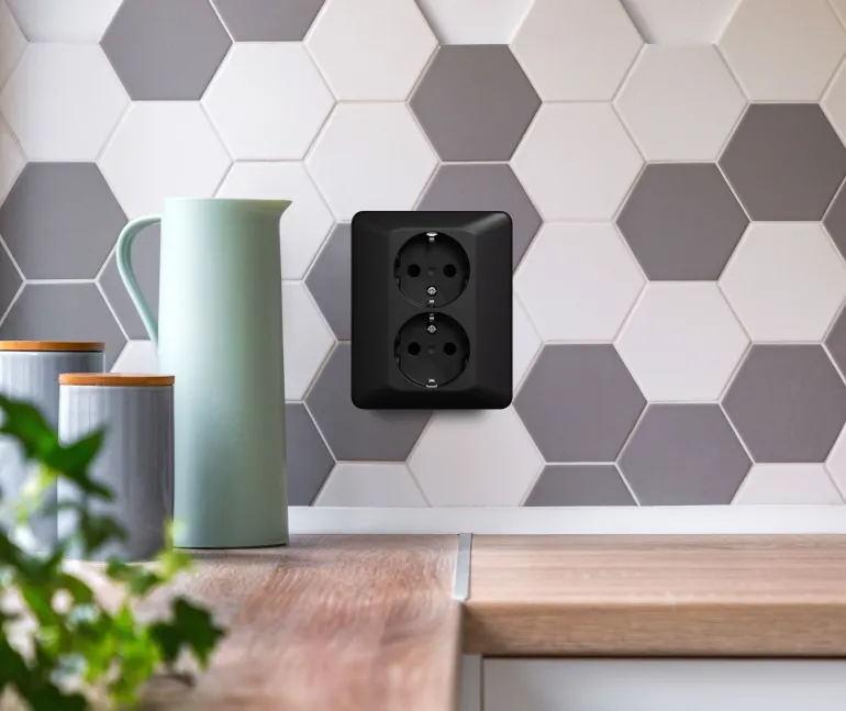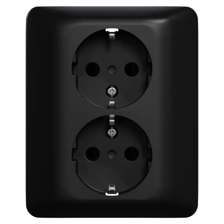 Musta 2-osainen pistorasia uudesti suunnitellulla pohjalla, joka helpottaa asennusta. Pohja lisää myös asennuksen turvallisuutta käytännöllisillä painikkeilla johdinten irrottamista varten. 6×2 pikaliittimet FK- ja EK-johtimia varten.