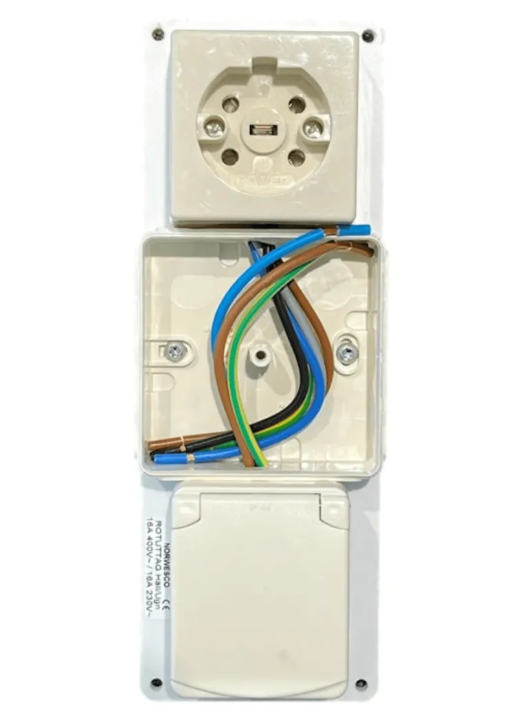 Norwesco 271016 on levyyn asennettu pistoke (Perilex), johon kuuluu liitäntärasia ja Schuko-pistorasia. Helpottaa keittotason asentamista erillisellä uunilla.