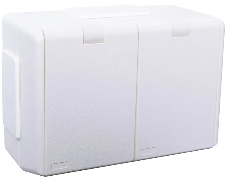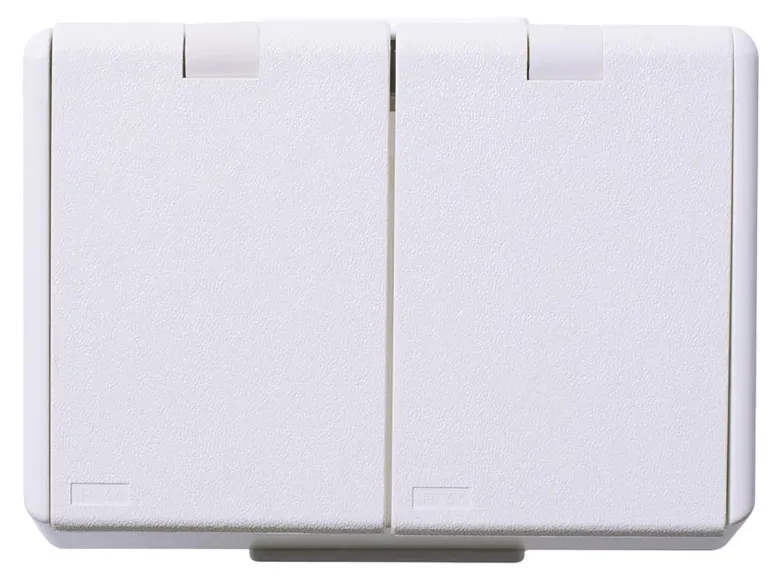 Kannellinen pinta-asennettava pistorasia. Erillinen pistorasiapesien syöttö toisen tai molempien pesien ohjaamiseksi erikseen kytkimellä, ajastimella tms. 16A, 440V.