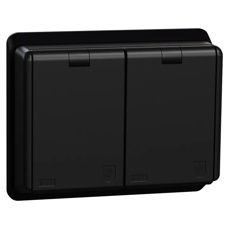 Musta 2-osainen pistorasia, joka on maadoitettu ja tarkoitettu uppoasennettavaksi kojerasiaan (ruuvien kiinnitysväli 60 mm). Roiskevedeltä suojattu IP44-luokituksella ja varustettu itsesulkeutuvilla kansilla. Kannet tulee asentaa niin, että kansi avataan alapuolelta. Valmistettu halogeenittomasta kestomuovista. Kaksinkertaiset liitännät vaihetta kohti. Toimitetaan täydellisenä kojesuojan kanssa. Asennussyvyys 20 mm.